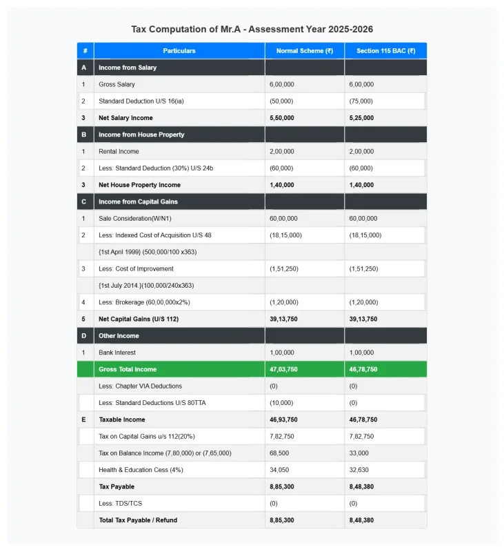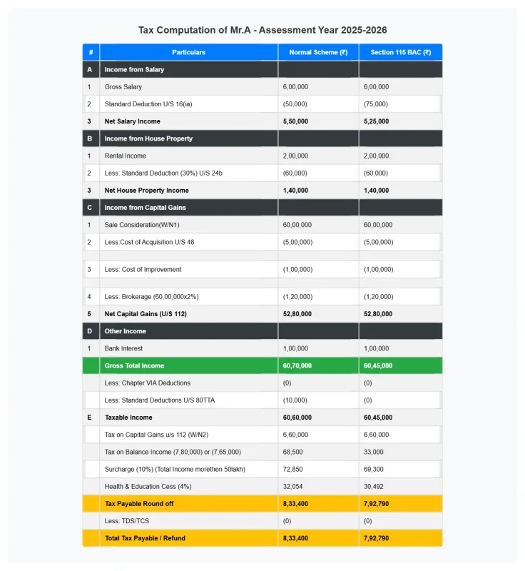 Compute the total taxable income and tax liability (Default Tax Regime and Regular Tax Regime) of Mr. A for Assessment Year 2025-26, considering that the sale was made before 23rd July 2024.