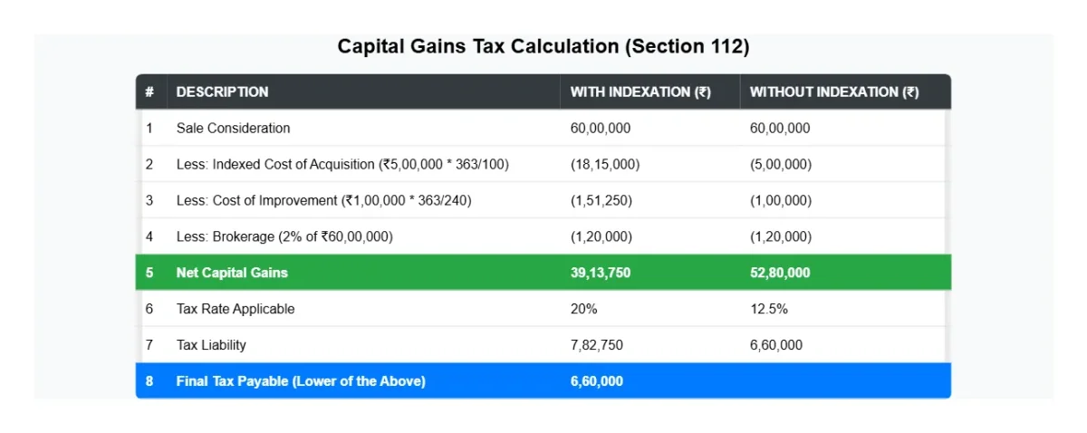 Since the SDV (βΉ65,00,000) is less than βΉ66,00,000, the actual sale price of βΉ60,00,000 will be considered for capital gains calculation.